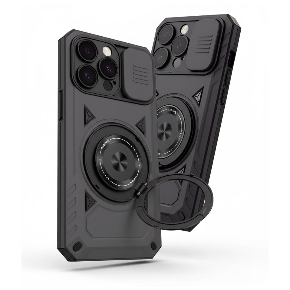 Funda protectora de alto impacto con anillo giratorio integrado en el centro. Compatible con soporte magnético para auto. Diseño resistente y funcional que combina protección y practicidad.